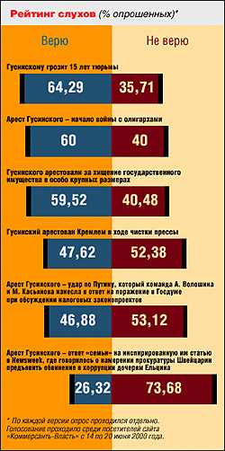 Всего за неделю, прошедшую с момента ареста Владимира Гусинского, я опросил 29 москвичей. Из них шестеро не смогли ответить на вопрос, правильно или нет, по их мнению, арестовали Гусинского; четверо ответили, что Гусинского надо было посадить давно и надолго; семеро сошлись во мнении, что Гусинский, конечно, украл десять миллионов долларов и, может быть, даже одиннадцать, но при этом его надо отпустить, и правильно отпустили, по причине презумпции невиновности, а там пусть суд решает; пятеро — что, если уж освободили, то теперь его немедленно надо выслать в Израиль; еще семеро — что все, что произошло с Гусинским, это попытка власти задушить свободу слова в России.