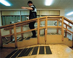 | На этих тренажерах раненые солдаты и офицеры учатся ходить. Этот парень уже передвигается без помощи медсестры |