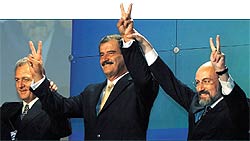 | Победа Висенте Фокса (в центре) стала триумфом демократии после 70 лет однопартийной системы |