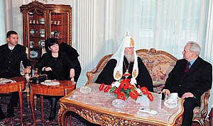 | Слободан Милошевич, Мирьяна Маркович и их сын Марко позируют на фоне высокого гостя - патриарха Алексия II |