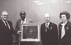| Март 1976 года. Поддерживая стремление американских коммунистов оседлать негритянское движение, секретарь ЦК Борис Пономарев и космонавт Валентина Терешкова подарили Гэсу Холлу и национальному председателю КП США Генри Уинстону портрет их нового товарища Анжелы Дэвис кисти неизвестного советского художника |