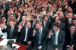Раньше других в новой партсистеме оформился левый фланг. Его ядром, как и следовало ожидать, стали коммунисты, позиция которых за минувший год претерпела весьма заметную эволюцию. Начав с осторожной поддержки президента Путина в мае прошлого года, КПРФ прошла через эпопею с неудавшимся вотумом недоверия правительству и докатилась до откровенной критики главы государства за продолжение "антинародного ельцинского курса", прозвучавшей на апрельском пленуме ЦК 2001 года.