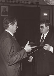 | Бакатин считал, что спасти хоть что-то от КГБ можно лишь договариваясь по-хорошему с откалывающимися республиками (на фото — с премьером Эстонии Эдгаром Сависааром) |