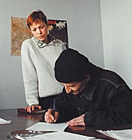 | Владимир Епишин пишет грузинской полиции расписку о том, что доверяет корреспонденту "Власти" Ольге Алленовой (слева) |