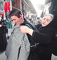 | Епишин примеряет новую одежду с радостью ребенка. "Ничего, дедуля,— говорит торговка.— Ты еще хоть куда!" "Какой дедуля! — возмущаемся мы.— Ему и сорока девяти еще нет!" |