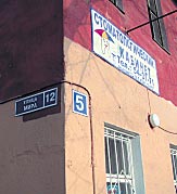 Мы сворачиваем в короткую улочку, запруженную машинами: слева — забор, справа — ряд обшарпанных домов из красного кирпича, впереди — тупик. Краем глаза я замечаю табличку на углу одного из зданий: "Мира, 12". На нем две вывески — "Стоматология" и "Продукты".