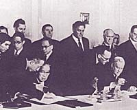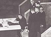| 8 сентября 1951 года, Сан-Франциско. Японский премьер Сигеру Иосида подписывает мирный договор, по которому Токио отказывается от Курильского архипелага. Позднее, воспользовавшись тем, что СССР отказался подписывать Сан-Францисский договор, Токио стал утверждать, что группа островов к югу от острова Уруп, включающая Южные Курилы, к Курильскому архипелагу не относится, а является "естественным продолжением" самого северного японского острова Хоккайдо |