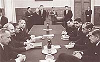 | 19 октября 1956 года, Москва. Премьер-министр Японии Итиро Хатояма и глава советского правительства Николай Булганин подписывают Совместную декларацию СССР и Японии. Ее 9-я статья гласила, что после заключения мирного договора с Японией СССР передаст ей острова Хабомаи и Шикотан. Вспыльчивый Хрущев, впрочем, вскоре отказался от обещания по поводу Шикотана и Хабомаи, обидевшись на то, что в Японии после прекращения американской оккупации остались военные базы США |