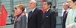 | 16 апреля 1991 года, Токио. Президент СССР Михаил Горбачев с императором Японии Акихито во время государственного визита в Японию. После десятилетий нежелания признавать наличие территориальной проблемы в отношениях с Токио Москва наконец согласилась — проблема есть. При этом, желая радикально улучшить отношения с Токио, Михаил Горбачев несколько поспешно очертил и границы спорного района — все Южные Курилы |