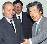 | 21 июля 2001 года, Генуя. Президент РФ Владимир Путин и премьер-министр Японии Дзюнъитиро Коидзуми на саммите G8. После того как в сентябре 2000 года в ходе визита в Токио Владимир Путин заявил, что Россия признает декларацию 1956 года, и даже высказал готовность после подписания мирного договора начать переговоры об условиях передачи Шикотана и Хабомаи, ситуация в двусторонних отношениях, казалось, начала выправляться. Однако прорыва достичь не удалось. Путин пояснил, что Россия не имеет никаких обязанностей в отношении Кунашира и Итурупа — большей, самой населенной и развитой части Южных Курил. Такая постановка вопроса не устраивает японцев. Ситуация снова зашла в тупик |