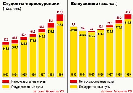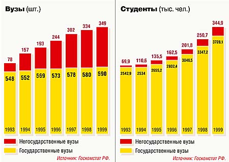 Но так ли много у нас в стране тех, кто учится за деньги? По официальным данным, только с 1993-го по 1999 год количество вузов и студентов в России выросло примерно в 1,5 раза, причем рост числа вузов происходил в основном за счет негосударственных (оно увеличилось в 4,5 раза), а студентов — за счет государственных (см. рисунки). Количество бюджетных мест в вузах почти не меняется, следовательно, прирост числа студентов произошел за счет тех, кто платит.