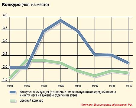 Престижные вузы, где конкурс в советские времена составлял пять, а то и десять человек на место, оказались в трудном положении: резкое увеличение числа мест в институтах — и числа самих институтов — привело к падению конкурса. В принципе в этом нет ничего страшного. На Западе лишь очень немногие знаменитые на весь мир университеты имеют возможность отбирать абитуриентов по их академическим достижениям. Большинство университетов принимают 90% желающих, отказывая лишь заведомо слабым. Аналогичная ситуация, кстати, была в СССР в начале 1960-х годов, когда дневные отделения вузов могли принять почти столько же молодежи, сколько заканчивало среднюю школу. Впоследствии конкурс стал расти и достиг максимума в середине 1970-х годов, когда поступить на дневное отделение мог лишь каждый четвертый выпускник средней школы (см. рисунок). С тех пор число мест в вузах постоянно увеличивалось, а число выпускников — сокращалось.