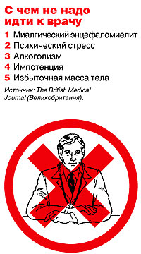 Это следует из последнего номера ведущего британского журнала для врачей The British Medical Journal, в котором опубликован список "неболезней", составленный редакцией по результатам опроса своих читателей. По определению журнала, неболезнь — "состояние, некоторыми определяемое как заболевание, которое, однако, переносилось бы лучше, если бы не считалось таковым". Результаты опроса шокировали общественность. Читатели не считают заболеванием миалгический энцефаломиелит (в просторечии — синдром хронической усталости), который, как утверждают многие специалисты, отправляет на тот свет ежегодно несколько тысяч человек, алкоголизм, кажется уже всеми признанный серьезным заболеванием, требующим лечения, и даже сахарный диабет.