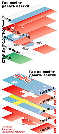 Международная организация Transparency International опубликовала рейтинг взяткодателей — стран, частные фирмы которых больше всех склонны добиваться выгодных контрактов при помощи взяток. При составлении рейтинга были опрошены должностные лица и представители деловых кругов 15 стран с развивающейся экономикой. Выяснилось, что самые честные бизнесмены живут в Австралии, а самые нечестные — в России (см. справку). Попутно выяснилось, что чаще всего взятки предлагают производители оружия и инвесторы, занимающиеся недвижимостью. Вместе с рейтингом взяткодателей опубликован и список самых нечестных государств — тех, чьи правительства чаще всех склонны использовать нечестные средства ради того, чтобы их компании получили самые выгодные иностранные государственные контракты. В этом рейтинге Россия занимает лишь шестое место. Самым честным правительством признано шведское, самым нечестным — американское.