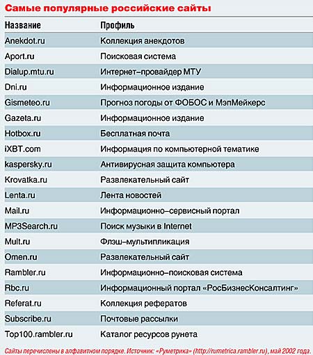 Портал "Рамблер" в рамках проекта "Руметрика" определил двадцать самых популярных сайтов рунета за апрель 2002 года. Отбор производился на основе данных рейтинга Rambler`s Top 100, в котором зарегистрировано около 70 тыс. активных интернет-ресурсов. Это можно считать недостатком проекта. К примеру, такие лидеры рунета, как Яndex.ru и Google, в состав двадцатки не попали, так как в Rambler`s Top 100 не зарегистрированы. Стоит также обратить внимание и на то, что двадцатка — не рейтинг, а просто список лучших, составленный в алфавитном порядке. Участники списка работают в разных сферах, сравнивать их между собой по показателям посещаемости — все равно что проводить соревнования автогонщиков с трактористами.