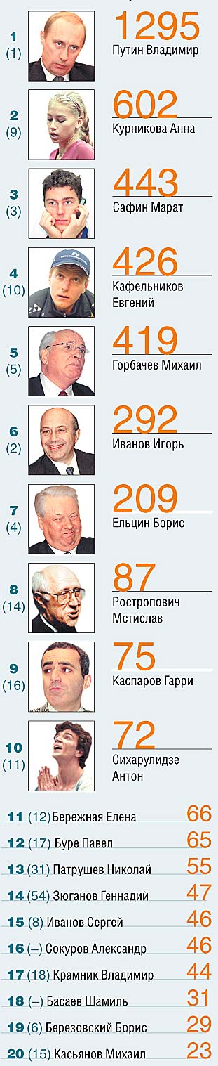 В остальном майские итоги не удивляют: скандал с публикацией фотографий то ли Анны Курниковой, то ли Юдит Солтеш-Бенеттон в журнале Penthouse гарантировал российской теннисистке второе место в рейтинге; продолжающийся скандал во французской конькобежной ассоциации не давал газетам забыть об Антоне Сихарулидзе и Елене Бережной, а первое появление имени Мстислава Ростроповича в десятке самых упоминаемых объясняется его участием (как музыканта, а не гостя) в торжествах, посвященных 50-летию восшествия на престол королевы Елизаветы II. Наконец, Шамиль Басаев впервые оказался в числе двадцати самых упоминаемых россиян из-за сообщений (теперь вроде бы опровергнутых) о его гибели.