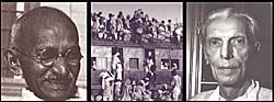 | Один из основателей новой Индии Махатма Ганди (слева) считал, что индусы и мусульмане могут счастливо жить в одной стране. Основатель Пакистана Мухаммед Али Джинна (справа) придерживался противоположных взглядов: две общины должны жить отдельно. Вскоре после того, как Индия и Пакистан обрели независимость, в обеих странах началась межобщинная резня. Около миллиона человек погибли, 17 миллионов стали беженцами (в центре) |