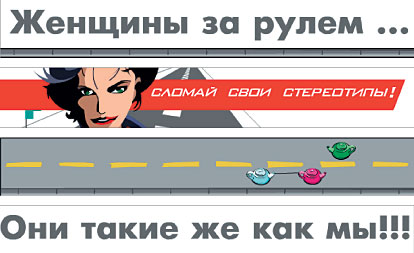 Объект социальной рекламы, которую показывают web-дизайнеры, также выбран с умом — это женщина за рулем. "Задача разрабатываемой участниками фестиваля социальной рекламы — разрушить негативный стереотип, сложившийся у большинства мужчин, о том, что женщина не может быть хорошим водителем",— сообщают организаторы конкурса, медиаагентство AdWatch и интернет-портал Rambler. В самом деле, голодные беспризорники или нуждающиеся в лечении наркоманы уже примелькались, а дама-шофер — объект, интересующий всех. "Женщины за рулем — они такие же, как мы!!!" — утверждает одна из конкурсных работ. Надо полагать, темой следующего фестиваля (он пройдет в январе-феврале 2003 года) будет что-то вроде "Негры тоже люди".