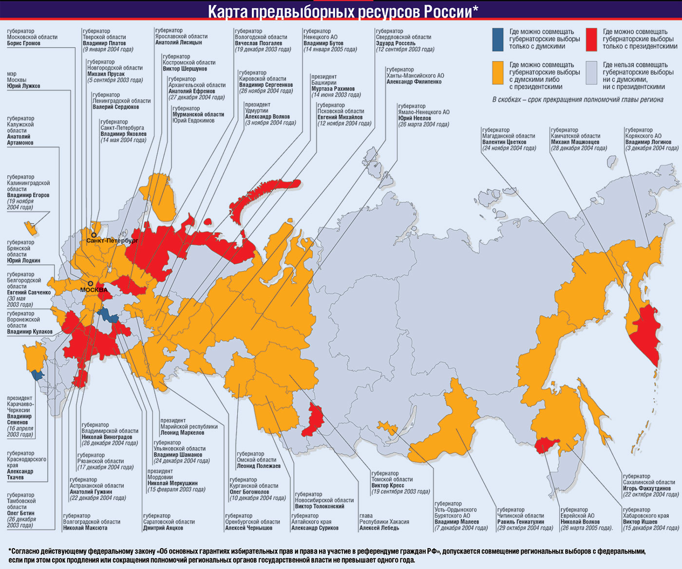Для не очень благополучных регионов, где Кремлю совсем недавно удалось отстранить от власти неугодных губернаторов, совмещение местных и федеральных выборов особенно важно. Например, на выборах 2004 года победа гарантирована президенту Марийской республики Леониду Маркелову. В ходе выборов 2000 года Кремль настолько желал отстранить от власти подозреваемого в связях с преступным миром Вячеслава Кислицына, что готов был рассматривать как собственную победу избрание любого кандидата. Теперь ему придется радоваться успеху кандидата от ЛДПР Маркелова еще четыре года.