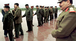 ФОТО: AFP Безопасность Саддама обеспечивают постоянные переезды из одного дворца в другой, многочисленные двойники, а также телохранители (на заднем плане), которых он при необходимости без всяких колебаний меняет при помощи личного оружия |