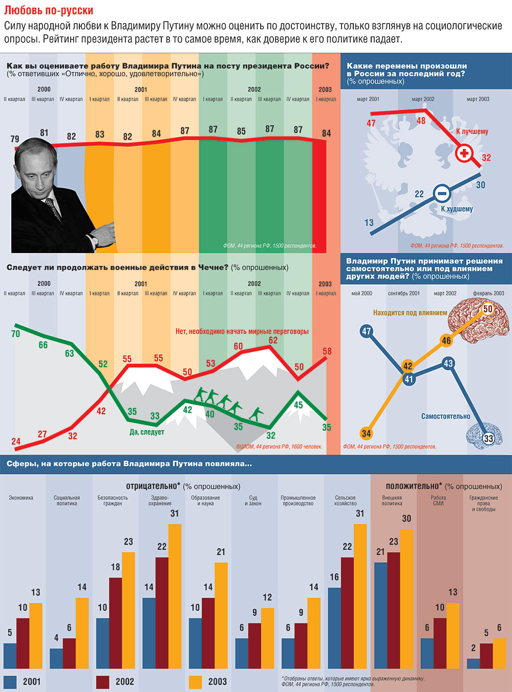 Граждане охотно конкретизируют свои претензии: по мнению более чем 20% населения, деятельность Путина отрицательно сказывается на здравоохранении, образовании, науке, сельском хозяйстве и безопасности самих граждан. Правда, почти треть населения отмечает успехи во внешней политике, но, согласитесь, сельское хозяйство сердцу простого россиянина все-таки гораздо ближе. Полный крах в глазах народа потерпела политика президента в Чечне. Памятный всем лозунг о сортирах разонравился гражданам еще в 2001 году, и с тех пор ситуация практически не изменилась. Но может быть, люди просто надеются, что все еще переменится к лучшему — стоит только дать президенту достаточно времени? Он наведет в стране порядок, поправит экономику, и уровень жизни населения повысится? Таких много, но становится все меньше. За три года без малого 10% граждан избавились от подобных иллюзий. Элементарная логика заставляет сделать вывод, что авторитет президента в глазах населения сильно упал. И совершенно ошибочный вывод: рейтинг Путина, как хорошо видно на графике, не только не упал, а, напротив, несколько вырос. Объяснить этот парадокс можно только одним способом: Россия — особенная страна, где верховную власть и ее политику граждане воспринимают совершенно отдельно друг от друга. В жизни — да, есть проблемы. Но причем здесь президент — этот энергичный, авторитетный, честный и опытный лидер? Совершенно ни при чем. И логика ни при чем. Не даром соцопросы показывают, что даже чисто внешне президент стал за три года вдвое привлекательнее. ПАВЕЛ ЧЕРНИКОВ |