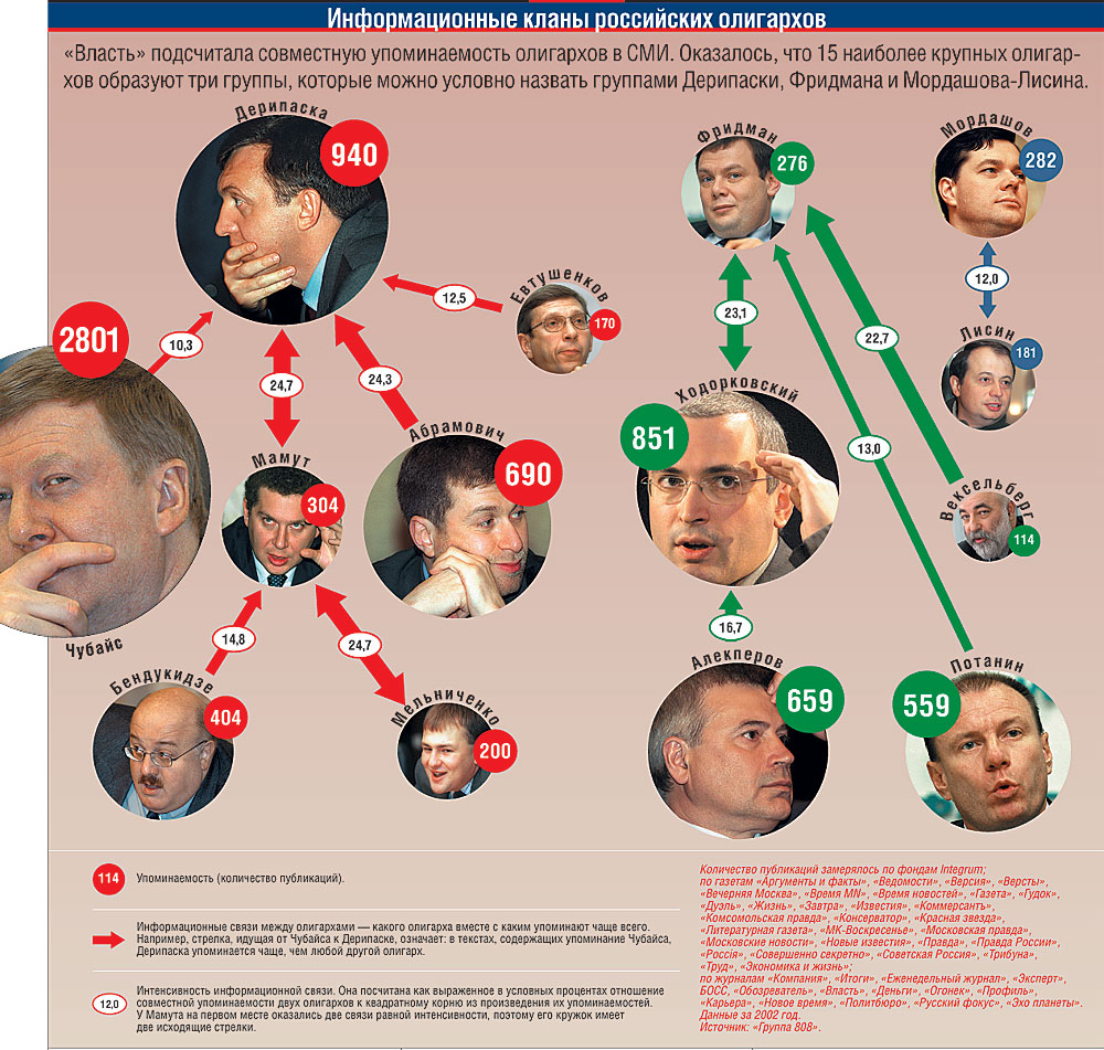 Гусинский Владимир 12,06 Абрамович Роман 10,72 Пугачев Сергей 10,09 Потанин Владимир 9,48 Дерипаска Олег 8,30 Фридман Михаил 7,25 Мордашов Алексей 7,09 Мамут Александр 5,92 Бендукидзе Каха 5,69 Мельниченко Андрей 5,50 Ходорковский Михаил 5,41 Евтушенков Владимир 4,71 Махмудов Искандер 4,41 Вексельберг Виктор 4,39 Лисин Владимир 3,87 Алекперов Вагит 3,34 Чубайс Анатолий 2,71 Швидлер Евгений 2,14 *Выраженное в процентах отношение числа публикаций российской прессы, в которых лицо упоминается в качестве олигарха, к числу всех публикаций, в которых оно упоминается. Данные за 2002 год. **При подсчете не принимались во внимание слова "бывший" и "опальный", стоящие со словом "олигарх" Замеры выполнены по фондам Integrum; по газетам "Аргументы и факты", "Ведомости", "Версия", "Версты", "Вечерняя Москва", "Время MN", "Время новостей", "Газета", "Гудок", "Дуэль", "Жизнь", "Завтра", "Известия", "Коммерсантъ", "Комсомольская правда", "Консерватор", "Красная звезда", "Литературная газета", "МК-Воскресенье", "Московская правда", "Московские новости", "Новые известия", "Правда", "Правда России", "Россiя", "Совершенно секретно", "Советская Россия", "Трибуна", "Труд", "Экономика и жизнь"; по журналам "Компания", "Итоги", "Еженедельный журнал", "Эксперт", БОСС, "Обозреватель", "Власть", "Деньги", "Огонек", "Профиль", "Карьера", "Новое время", "Политбюро", "Русский фокус", "Эхо планеты". Источник: "Группа 808". Кто компроматнее* Березовский Борис 2778 Чубайс Анатолий 1673 Гусинский Владимир 1497 Абрамович Роман 771 Дерипаска Олег 660 Алекперов Вагит 515 Потанин Владимир 491 Ходорковский Михаил 333 Мамут Александр 312 Фридман Михаил 300 Мельниченко Андрей 292 Пугачев Сергей 258 Мордашов Алексей 130 Евтушенков Владимир 129 Бендукидзе Каха 125 Махмудов Искандер 120 Вексельберг Виктор 102 Лисин Владимир 63 Швидлер Евгений 50 *Число компроматных публикаций, в которых упоминается лицо. Компроматными считаются все материалы сайтов, специализирующихся на публикации компромата. Данные на 1 марта 2003 года. Замеры выполнены по сайтам Compromat.ru, Kompromat.ru, FLB.ru, APN.ru и по газете "Стрингер". Данные для Compromat.ru получены с помощью поисковой системы Yandex, для Kompromat.ru, FLB.ru и APN.ru — по фондам Integrum, для газеты "Стрингер" — по фондам Публичной библиотеки. Источник: "Группа 808". Кто из миллиардеров вам наиболее симпатичен? (%) Никто 61 Михаил Ходорковский 20 Роман Абрамович 9 Вагит Алекперов 7 Михаил Фридман 3 Источник: "Рокфеллер" (www.rokf.ru), 1115 человек, март 2003 года. |