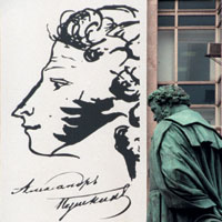 Свой самый известный автопортрет Пушкин нарисовал в Москве в конце 1820-х в альбоме Елизаветы Ушаковой, сестры любимой им Екатерины Ушаковой, на которой поэт даже собирался жениться. Альбом барышень Ушаковых хранился у их потомков, пока в 1880 году во время пушкинских торжеств по случаю открытия памятника работы Александра Опекушина не был передан на выставку. Экспонаты знаменитой московской выставки были воспроизведены в книге — и именно это можно считать началом канонизации изображения. Способствовал ей и пушкинист Абрам Эфрос, который назвал рисунок "автопортретом в образе поэта", тем самым объяснив причины его популярности. Но окончательно канонизировала его "Литературная газета", которая в 1967 году начала использовать автопортрет в эмблеме. Спустя несколько лет к Пушкину добавили стилизованного Горького — получилось так, как будто Пушкин нарисовал и его портрет на полях своей рукописи. В эпоху перестройки Горького, правда, убрали.
