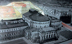Доминик Перро, объясняя мне принцип своей работы, говорил, что если традиционный модернизм работает с историей — противостоит ей или находит формулы ее развития,— то он работает с географией. Петербург — город абсолютно однообразного плоского рельефа. Ему нужна гора. Два года назад Эрик Мосс, объясняя принципы своей работы, говорил, что существует, по его мнению, слабая архитектура и сильная. Слабая следует логике города и подчиняется ей. Сильная вытаскивает из города какой-то непроявленный пласт энергетики. Например, сильной архитектурой в Петербурге является постамент Медного всадника. Городу нужна скала, и его театр — это скала. У того гора, у этого скала. Почувствуйте разницу.
