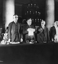 ФОТО: РГАКФД\РОСИНФОРМ Менжинский незримо присутствовал на всех показательных политических процессах 20-х годов (на фото — вынесение приговора обвиняемым по "шахтинскому делу") |