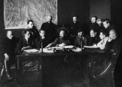 ФОТО: РГАКФД\РОСИНФОРМ В коллегии ГПУ (в центре — Феликс Дзержинский) Вячеслав Менжинский (справа от шефа) выполнял функции ученого секретаря — он курировал работу с научной, творческой и антисоветской интеллигенцией |