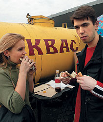 С первой жарой каждый год зелено-желтые резервуары с квасом начинают роиться около автобусных остановок и станций метро как осы. Литр стоит примерно 60 центов. Уличные торговцы наполняют пластиковые стаканы темной пенящейся жидкостью. Москвичи по пути на работу или в школу опрокидывают стаканчик-другой кваса, как они обычно это делают с водкой, а бабушки возят домой тележки с литром-двумя в бутылках.