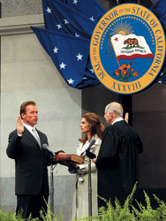 Как и следовало предполагать, инаугурация столь искушенного в шоу-бизнесе человека, как новый губернатор Калифорнии Арнольд Шварценеггер, была превращена в настоящее шоу. 38-й губернатор Калифорнии приносил присягу, положив руку на старинную семейную Библию в кожаном переплете, которую он привез из Австрии. Саму Библию держала красавица-жена Мария Шрайвер. Голос губернатора, спокойный во время принесения присяги, задрожал, когда он, обращаясь к калифорнийцам сказал, что "чувствует смирение и гордость" от того, что стал их губернатором, и пообещал в своих действиях руководствоваться только интересами граждан штата. Картину дополняли несколько иностранных делегаций, представлявших на церемонии 13 государств, в том числе, Канаду, Египет, Австрию и Мексику. Впрочем, самым эффектным моментом инаугурации стал ее финал, когда новый губернатор принялся выполнять обещание действовать в интересах всех калифорнийцев. Присев на ступени калифорнийского Капитолия, Шварценеггер подписал указ, отменяющий решение своего предшественника втрое увеличить налог на регистрацию автомобилей.