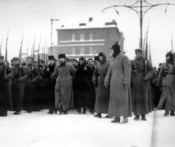 ФОТО: РГАСПИ\РОСИНФОРМ "Мы в фуражках,— вспоминал охранник Соколов.— Мы провожали гроб до этого самого, до станции железнодорожной." |