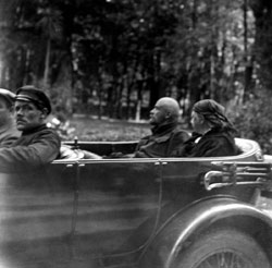 Мы вышли. Подъезжает машина. Комиссар подходит, открывает дверь. Выходит мужчина в желтом вязаном джемпере, с подвязанной рукой. Наш комиссар за ним ухаживает. Затем вышли две женщины. Все вошли в дом. Подходит вторая машина, из нее выходят женщина и мужчина — Саша Сысоева и врач. Тут у нас появилась мысль: не Ленин ли приехал?"