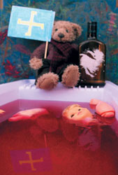 "Мы хотим, чтобы инсталляцию убрали,— твердил почувствовавший поддержку посол шведским журналистам,— и думаем, что шведское правительство должно этому поспособствовать. Это не искусство, а политическая провокация". Возможно, его подбодрила информация о том, что у здания посольства Швеции в Израиле появился ответ в художественной форме. Демонстранты выставили наполненную рукотворной кровью ванну, кинули в нее разломанную куклу, а у бортика усадили плюшевого мишку с сине-желтым флажком в руке, на котором шведский крест переделан в свастику.