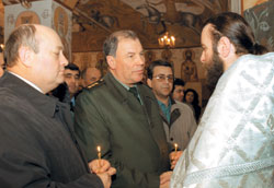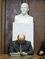 ФОТО: МИХАИЛ РАЗУВАЕВ Михаил Фрадков сменил много должностей, но никогда не бросался в глаза. С одинаковой скромностью он исполнял самые разные роли: оратора (на трибуне), государственного мыслителя (с Лениным), христианина (с начальником Генштаба Валерием Маниловым), и даже болельщика (с Владимиром Путиным на открытии чемпионата мира по хоккею в Петербурге) |