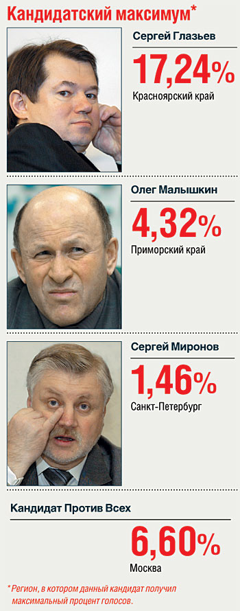 В целом по России Путин одержал над кандидатом Неприходько уверенную, хотя и далеко не сокрушительную победу: за действующего президента проголосовали 45,8% от списочного состава граждан, имеющих право голоса, тогда как отказались от участия в выборах лишь 35,7% избирателей. В то же время, хотя минимальная явка нигде не опустилась ниже требуемых по закону 50%, почти в трети субъектов федерации Неприходько все-таки удалось опередить президента. И именно на эти регионы федеральным властям придется теперь обратить особое внимание — если, конечно, Кремль не хочет, чтобы в 2008 году кандидат Неприходько одолел-таки преемника Владимира Путина.