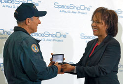 ФОТО: AP Представительница Федерального авиационного агентства США Патриция Смит вручила Майку Мелвиллу нагрудный знак коммерческого астронавта за номером 1, хотя военным пилотам США, летавшим на стратосферных самолетах гораздо ниже Мелвилла, давали значки настоящих астронавтов НАСА |