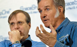 ФОТО: AP Перед мысленным взором конструктора космического такси Берта Рутана (справа) и его инвестора Пола Аллена (слева) проносятся тысячи спонсоров, бороздящих просторы Вселенной |