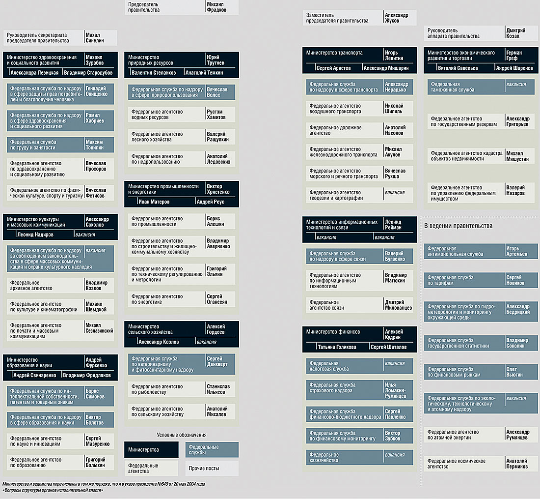 Так что, несмотря на заверения авторов административной реформы о том, что новая правительственная структура не претерпит в обозримом будущем серьезных изменений, можно все же предположить, что борьба за передел сфер влияния в новом госаппарате продолжится. И клеточки, в которые помещены аппаратчики в публикуемой "Властью" схеме, довольно скоро могут подвергнуться очередной перетряске.