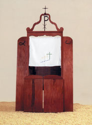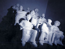 Что касается представительства России, то мы выступили вполне по международным правилам. Инсталляцию Cinema молодого скульптора Сергея Шеховцова (он же Поролон), перед этим показанную в Москве в галерее "Риджина", собственно и открывшей это имя, вполне можно было бы назвать бытовой зарисовкой, если бы не прямолинейная по-шекспировски метафора "весь мир — кинотеатр". В маленьком зале сидят люди, пялятся в экран. На месте экрана — посетители биеннале. Выходят и натыкаются на две фигуры — девушка в мини-юбке, поправляющая туфлю нагнувшись, и юноша, мочащийся в углу. Будь это дело отлито в бронзе или изваяно в мраморе, не миновать автору Госпремии. Но за несерьезный поролон, из которого "вырублены" фигуры, Госпремий не дают. Зато возят на биеннале.