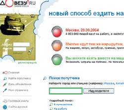 Москвичей, уставших добираться на работу в многолюдном наземном транспорте или, наоборот, скучающих от одиночества в автомобильных пробках, наверняка заинтересует открывшийся недавно ресурс www.dovezu.ru. Сайт, конечно, не предлагает тем и другим поменяться местами, просто его посетители могут выбрать себе попутчика — пассажира или водителя, чтобы вместе добираться до места работы по схожему маршруту. По замыслу авторов проекта в выгоде останутся и пассажиры, и водители: первым не придется толкаться в общественном транспорте, а вторые могут рассчитывать на компенсацию по крайней мере половины стоимости бензина. Впрочем, как утверждают создатели ресурса, смысл здесь не столько в экономии денег на дорогу, сколько в "возможности ездить с комфортом и познакомиться с интересными людьми, а возможно, и найти любовь". Стоит отметить, что идея поиска попутчика через интернет не нова, в сети есть множество туристических ресурсов, предоставляющих такую услугу для путешествующих по стране и за рубежом. Но в рамках столичного мегаполиса подобных проектов до сих пор не было. Желающие могут познакомиться с потенциальным попутчиком прямо на сайте — анкеты снабжены фотографиями, а с каждым пользователем можно пообщаться при помощи сервиса коротких сообщений. Жаль только, нельзя предугадать, к чему все это общение приведет.