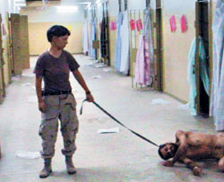 ФОТО: AP Женщины работают в американских тюрьмах и в Ираке, и на Кубе. Но если на Гуантанамо они обычно вели фривольные допросы, то в тюрьме Абу-Грейб (на фото) надсмотрщицы предпочитали держать дистанцию |