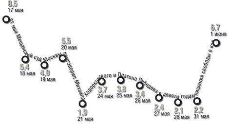 31 мая Мещанский суд Москвы приговорил Михаила Ходорковского и Платона Лебедева к девяти годам лишения свободы в колонии общего режима. Назначенный судом срок составляет 15,4% средней продолжительности жизни мужчин в России (58,5 года). Для оглашения приговора судье Ирине Колесниковой потребовалось в общей сложности 12 рабочих дней. Для сравнения: Ходорковский к моменту окончания процесса провел в СИЗО 583 дня (в 48 раз больше), Лебедев — 698 дней (в 58 раз больше). Чтение приговора стало объектом пристального внимания СМИ (и даже поводом для шуток: мол, подсудимых приговорили к пожизненному заслушиванию приговора). Однако интерес журналистов к процессу на протяжении последних двух недель неуклонно снижался. Так, итоги заседания суда 16 мая, на котором началось оглашение приговора, были освещены на следующий день в 8,5% материалов центральной прессы. Для сравнения: деятельность Владимира Путина в тот день была отражена в 11,3% публикаций. Но спустя две недели центральные газеты и журналы посвятили делу Ходорковского и Лебедева всего 2,2% материалов (см. график). Можно констатировать, что к концу второй недели интерес журналистов к чтению Ирины Колесниковой снизился почти в четыре раза. Отметим, что в материалах СМИ о процессе часто встречались слова "власть" (в 45,2% публикаций), "Путин" (31,6%) и "Кремль" (20,8%). Это и неудивительно. В 35% статей о деле Ходорковского и Лебедева так или иначе рассматривался его политический аспект.