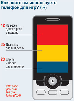 К такому выводу пришли эксперты компании iplay.com, проведшие исследование пристрастий пользователей мобильных телефонов. Результаты исследования показывают, что почти шесть из десяти американцев не менее двух раз в неделю играют в компьютерные игры, установленные в сотовых телефонах, для которых необходимы цветной экран, дополнительная память, и другие функции, делающие телефон дороже. Таких же, кто совсем никогда не играет, просто не нашлось.