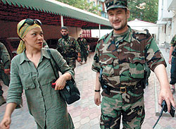 ФОТО: ВАЛЕРИЙ МЕЛЬНИКОВ "Сейчас уже проверки закончились, мы снова работает в нормальном режиме" (Сулим Ямадаев и Ольга Алленова, Гудермес, июль 2005 года) |
