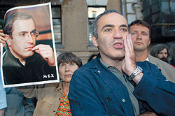 ФОТО: АЛЕКСЕЙ КУДЕНКО Михаил Ходорковский (на плакате) уверен, что вместе с братьями (на фото — Гарри Каспаров) и сестрами идет к победе |