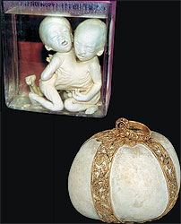 ФОТО: ЕВГЕНИЙ ПАВЛЕНКО Важное место в кунсткамерах занимали чудеса (mirabilia) — всякого рода природные аномалии. Хорошо еще, если это были простые безоары — камешки, найденные в пищеварительных путях жвачных животных (внизу, из собрания Габсбургов). В отличие от заспиртованных уродцев и мутантов, которые чаще всего попадали в данную категорию (вверху — экспонат петербургской Кунсткамеры), их хотя бы можно было украсить |