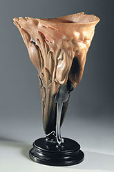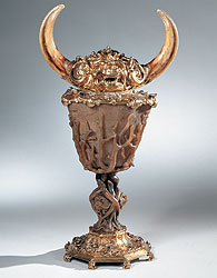 Европейские мастера часто обрабатывали заморские раритеты (exotica), чтобы подчеркнуть их экзотичность. Рог яванского носорога, например, превращен в "Падающий кубок" (на фото, Прага, 1610), украшенный причудливой резьбой. Другой кубок (внизу, Прага, 1611) сделан из рога африканского носорога, а украшением на его крышке стали клыки африканского кабана-бородавочника (оба экспоната из собрания Габсбургов) |