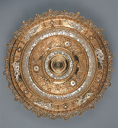 Ювелирное искусство позднего Ренессанса с его страстью к всяческой вычурности не могло пройти мимо редких и необычных природных материалов (naturalia). Эта серебряная рукомойная лохань (Нюрнберг, 1592; из собрания Габсбургов) украшена не только перламутром, но и тремя крупными жемчужинами неправильной формы. Такие жемчужины по-португальски назывались barocco — именно они дали название эпохе, в которую жанр кунсткамер достиг своего наивысшего и последнего расцвета |